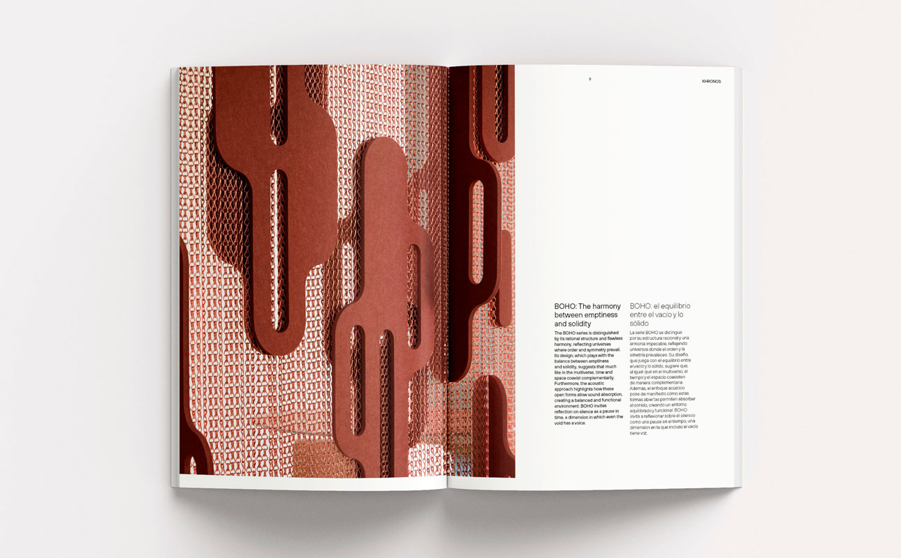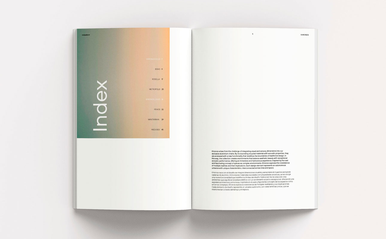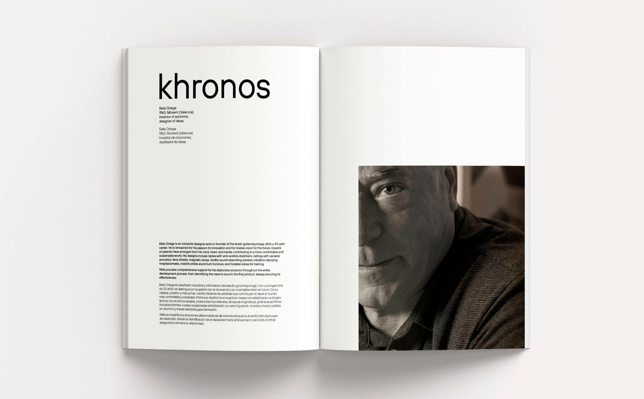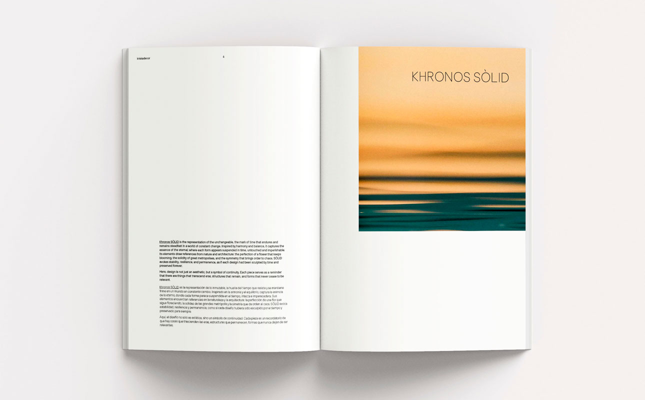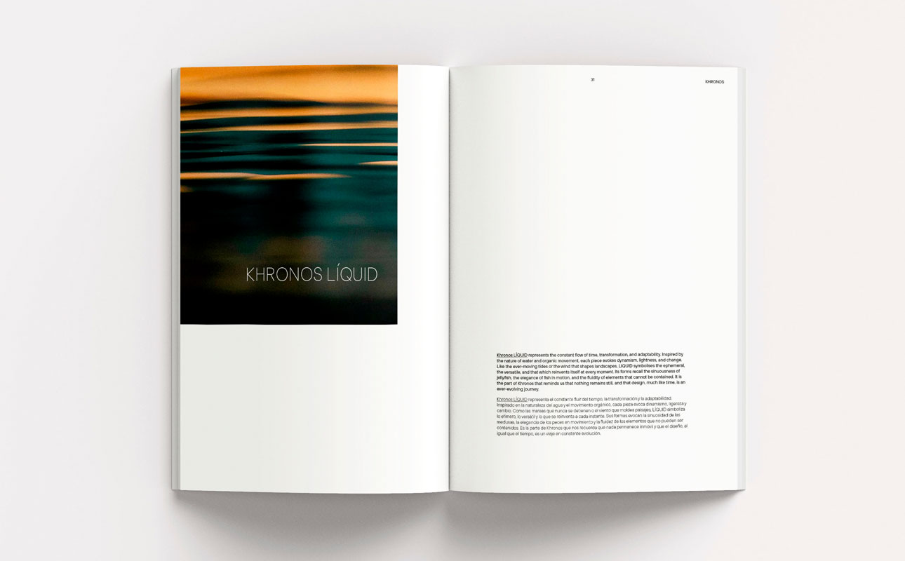 Desde gutierrezyortega nos encargamos de dar forma a todo el universo visual y conceptual que acompaña este proyecto tan atemporal. El catálogo, concebido como un objeto editorial que no solo informa, sino que emociona, actúa como una extensión física del alma de KHRONOS. Cada página está diseñada para sumergir al lector en una narrativa visual que refleja las dos naturalezas de la colección: SÒLID y LÍQUID, donde materialidad, geometría y movimiento dialogan con armonía.